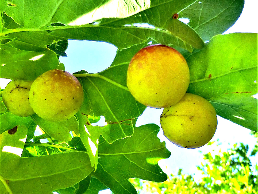 Die Eichengallen, auch Galläpfel genannt, bilden sich nach der Eiablage der Gemeinen Eichengallwespe (Cynips quercusfolii L.) in die Blattadern auf den Blattunterseiten der Eichenblätter.