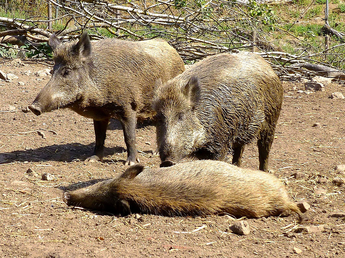 Das Wildschweingehege -angrenzend an den Kinderspielplatz- im oberen Parkbereich mit einem Keiler, Bachen, Frischlingen und Überläufern.